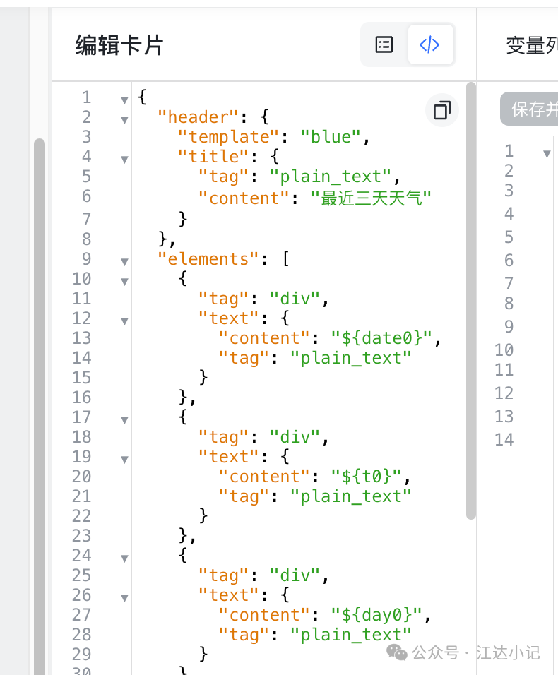 msg.MsgType = "interactive" msg.Card.Config.WideScreenMode = true msg.Card.Header.Template = "blue" msg.Card.Header.Title.Tag = "plain_text" msg.Card.Header.Title.Content = "最近三天天气"